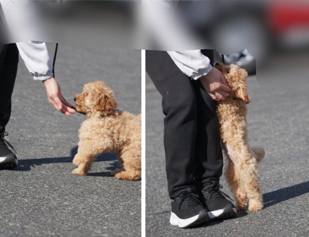 この日は、同じく合宿中のトイプードル女の子と一緒にお散歩の練習です。